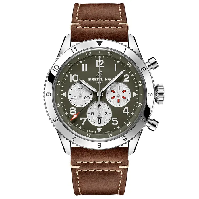 The Breitling Super AVI B04 Chronograph GMT 46 Curtiss Warhawk AB04452A1L1X1 watch has an Automatic movement with 10 Bar (100 meters) of water resistance, Stainless Steel case material, Grey dial color and Leather strap with 70 Hours of power reserve.