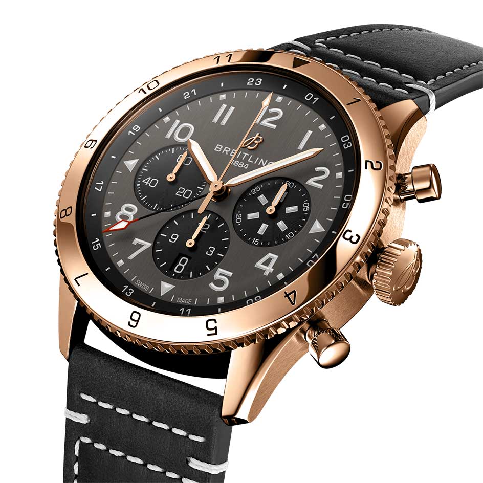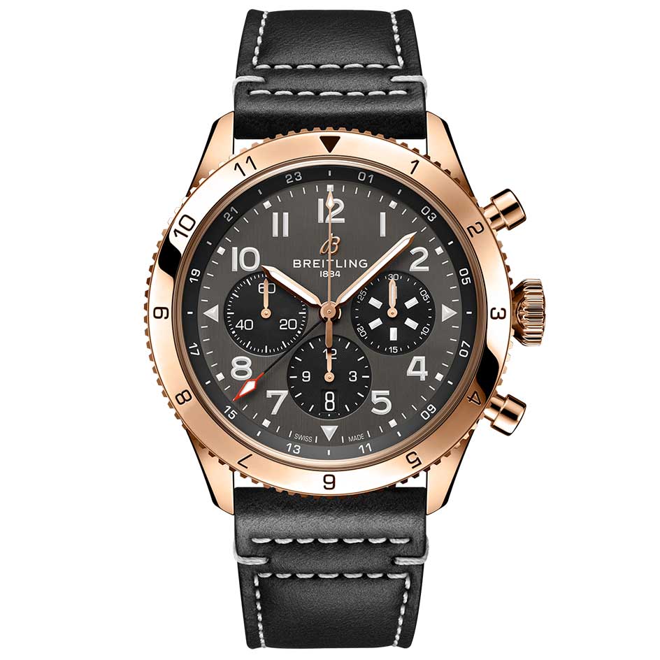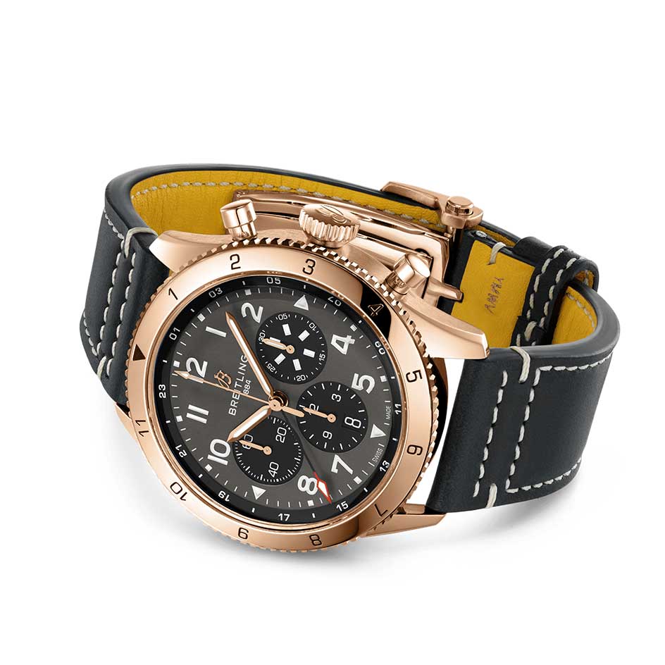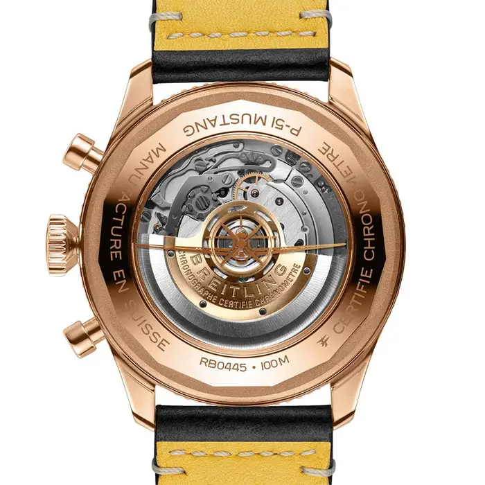 The Breitling Super AVI B04 Chronograph GMT 46 P-51 Mustang RB04451A1B1X1 watch has an Automatic movement with 10 Bar (100 meters) of water resistance, Stainless Steel case material, Grey dial color and leather strap with 70 Hours of power reserve.