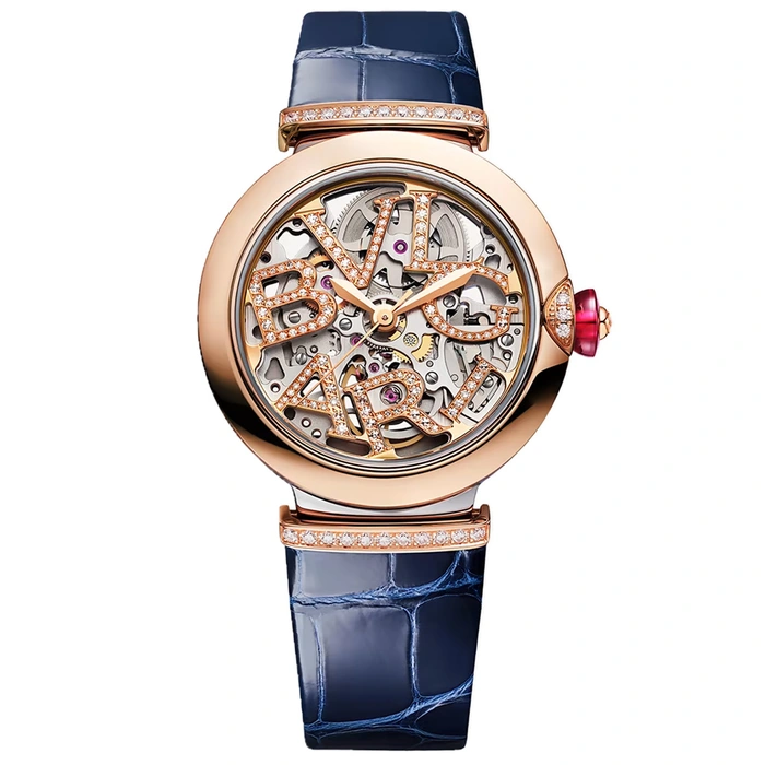 LVCEA Skeleton watch with mechanical manufacture movement, automatic winding and skeleton execution, stainless steel and 18 kt rose gold case, 18 kt rose gold openwork BVLGARI logo dial set with brilliant-cut diamonds and blue leather bracelet with 18 kt rose gold links set with diamonds.