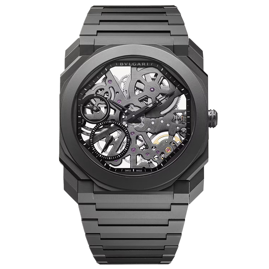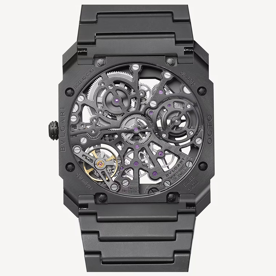 With its ultra-appealing monochrome ceramic look and functional aesthetics, the Octo Finissimo Skeleton watch offers Haute Horlogerie connoisseurs an insight into the inner workings of its movement, bringing a spectacular effect with an understated architectural elegance. Developed, produced and entirely assembled in-house, this watch is an exceptional piece in terms of its slenderness, finishes and the integration of innovative materials, where each component becomes part of a precious lace-like pattern, working in perfect harmony. Octo Finissimo Skeleton watch with extra-thin skeletonised mechanical manufacture movement, manual winding, small seconds and power reserve indication, BVL 128SK - Finissimo caliber (2.35 mm) and 65 hours power reserve. 40 mm extra-thin black ceramic case (5.50 mm thick), transparent case back, black ceramic crown set with ceramic element and black ceramic strap with folding clasp. Water-resistant up to 30 metres.