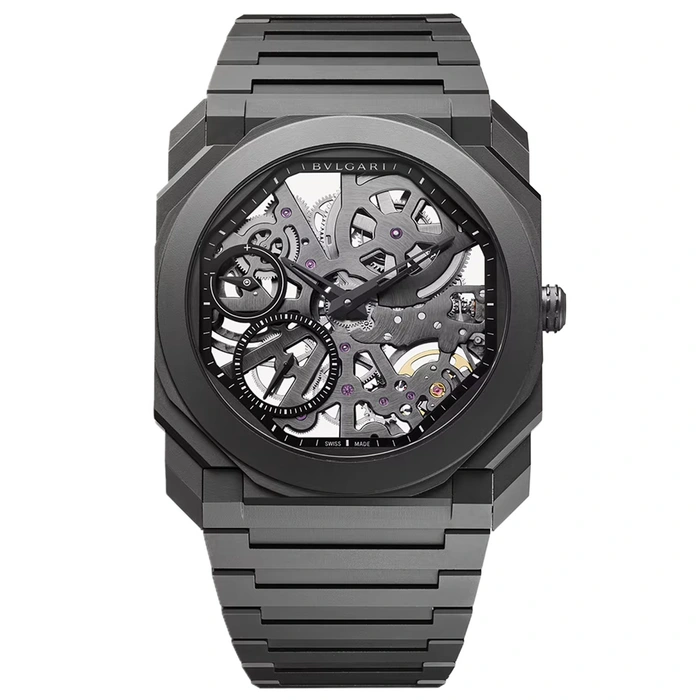 Octo Finissimo watch 103126 with 40 mm cermaic case with transparent case back. Skeletonized dial with minute, second and power reserve tracks. Ceramic bracelet with folding clasp. Manufacture BVL 128SK caliber with manual winding. Water resistant up to 30 meters.