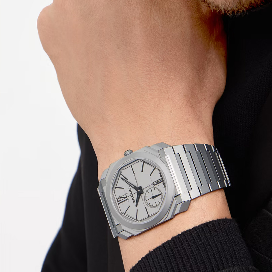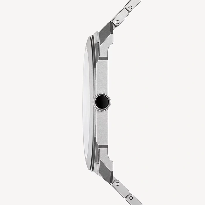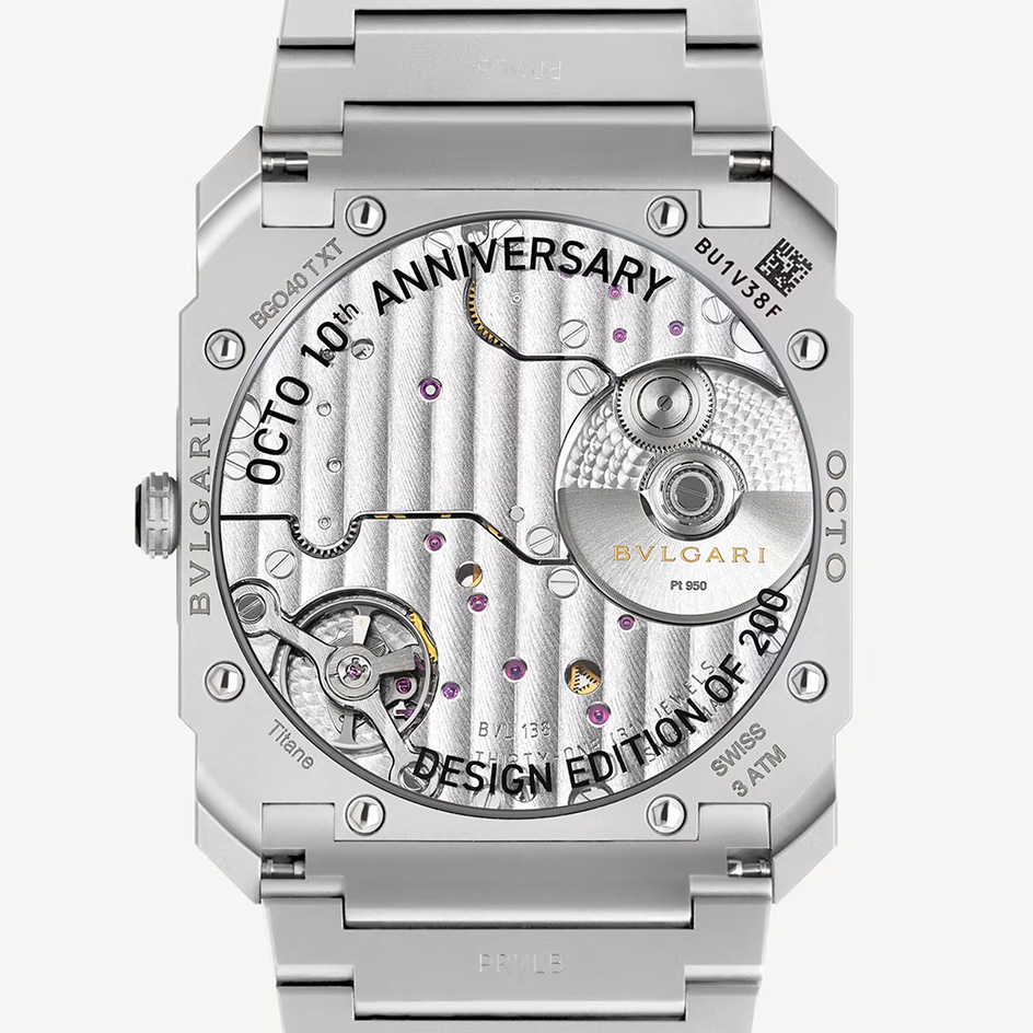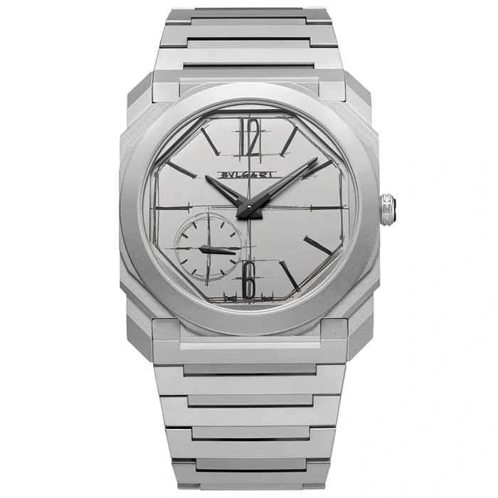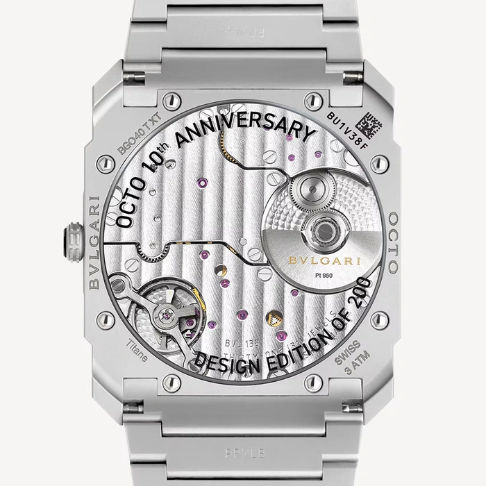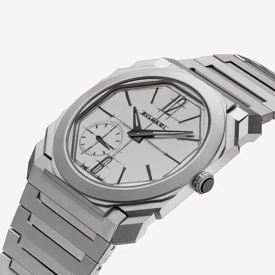 A true icon of the 21st century, the Octo Finissimo Automatic watch channels the rare fusion of edgy Italian design and Swiss engineering through its ultra-appealing look in sandblasted titanium and uncompromisingly forward-thinking mechanics. For this Special Edition, the display of the dial in matte grey sandblasted titanium replicates the very first Octo sketch by Fabrizio Buonamassa-Stigliani, Director of Bulgari's Watches Design Center, in a tribute to the bold spirit that marked the origins of the collection. Special Edition of 200 pieces.