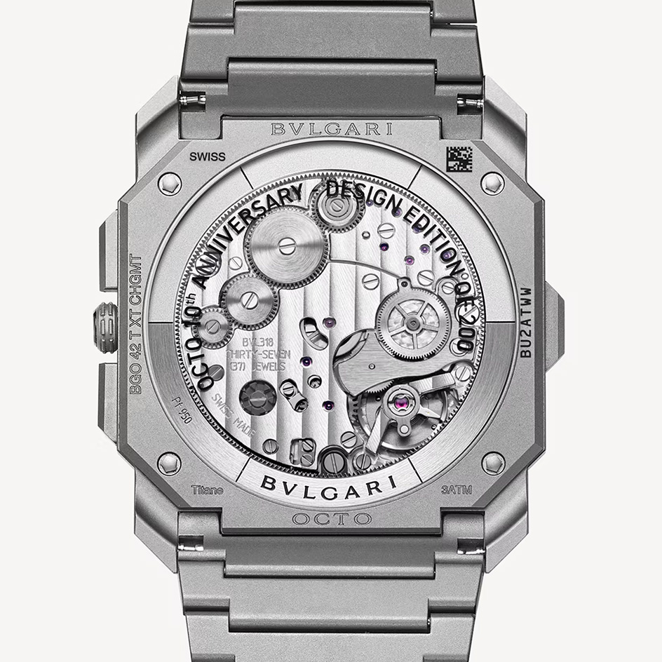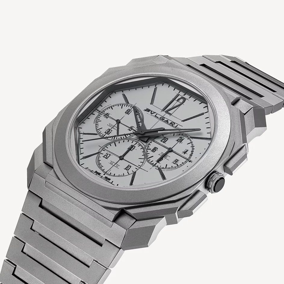 Octo Finissimo Chronograph GMT watch with mechanical manufacture ultra-thin movement (3.30 mm thick), automatic winding, BVL318 calibre, 28,800 vph (4 Hz) frequency, 37 jewels, 55-hour power reserve. 42 mm sandblasted titanium case, titanium crown with black ceramic insert, matte grey sandblasted titanium dial with displays replicating Fabrizio Buonamassa-Stigliani's first Octo sketch, engraved indexes, transparent caseback, sandblasted titanium bracelet and folding clasp. Water-resistant up to 30 metres. Special Edition limited to 200 pieces.