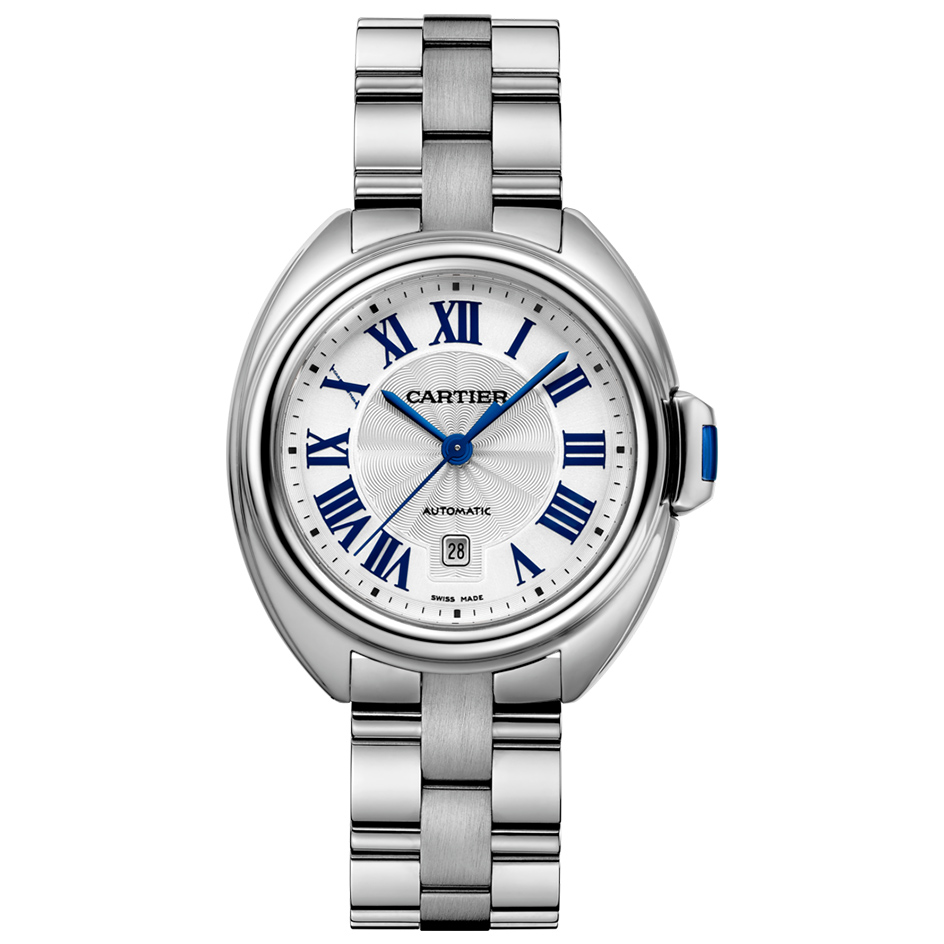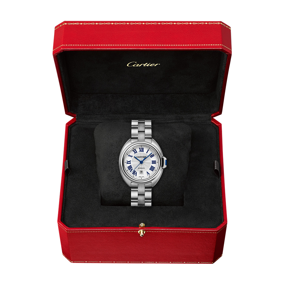 Cle de Cartier watch, 31 mm, self-winding mechanical movement. Steel case, key set with a synthetic spinel, silvered flinque sunray effect dial, blued-steel sword-shaped hands, sapphire crystal, steel bracelet. Case thickness: 11.04 mm. Water-resistant to 3 bar (approx. 30 metres).