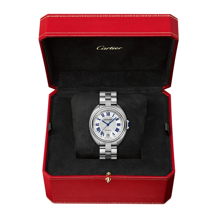 Cle de Cartier watch, 35 mm, Manufacture self-winding mechanical movement, calibre 1847 MC. Steel case, key set with a synthetic spinel, silvered flinque sunray effect dial, blued-steel sword-shaped hands, sapphire crystal and case back, steel bracelet. Case thickness: 10.09 mm. Water-resistant to 3 bar (approx. 30 metres).