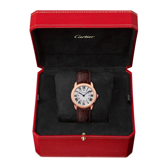 Ronde Solo de Cartier watch, small model, quartz movement. Case in 18K pink gold and steel, beaded crown in 18K pink gold set with a synthetic cabochon-shaped spinel, silvered opaline dial, Roman and Arabic numerals, sword-shaped hands in blued steel, sapphire crystal, strap in round-scale leather, ardillon buckle in 18K pink gold. Case dimensions: diameter: 29.5 mm, thickness: 6.35 mm, water-resistant to 3 bar (approx. 30 meters/100 feet).