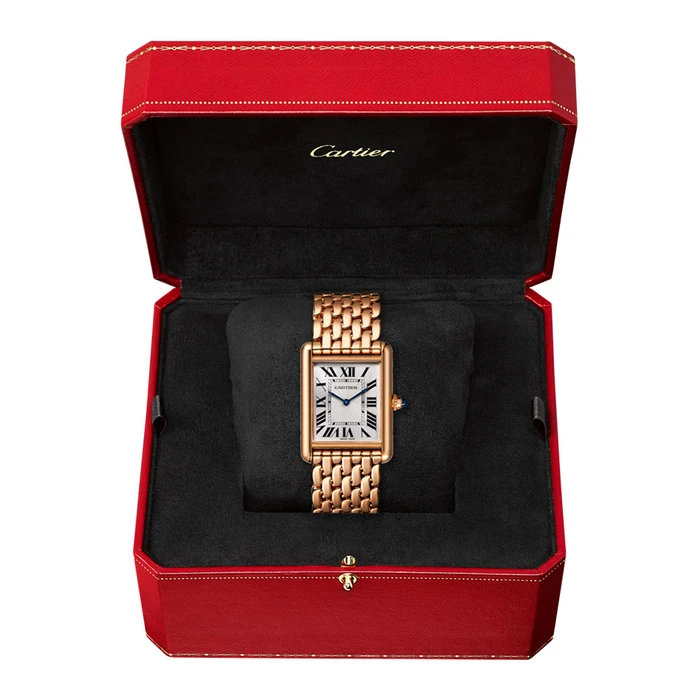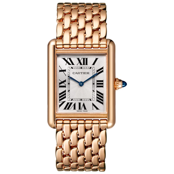 Tank Louis Cartier watch, large model, Manufacture mechanical movement with manual winding, calibre 1917 MC. Case in 18K rose gold, beaded crown set with a sapphire cabochon, silvered dial, blued-steel sword-shaped hands, mineral crystal, 18K rose gold bracelet. Case dimensions: 33.7 mm x 25.5 mm. Thickness: 6.6 mm. Water-resistant to 3 bar (approx. 30 metres).