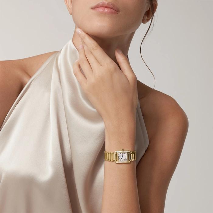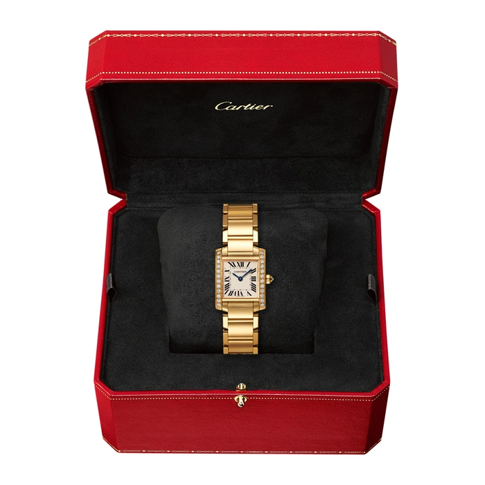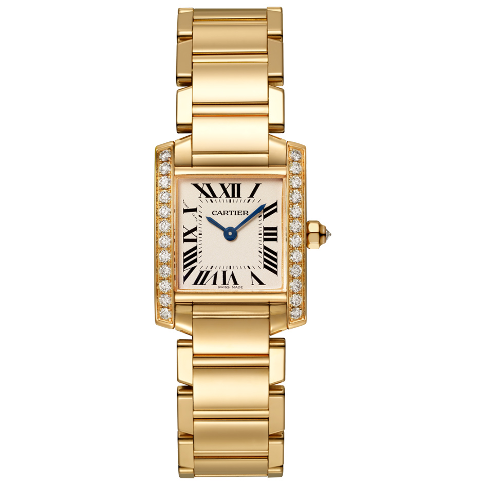 Tank Francaise watch, small model, quartz movement. 18K yellow gold case set with brilliant-cut diamonds. 18K yellow gold octagonal crown set with a brilliant-cut diamond. Silvered dial, blued-steel sword-shaped hands, sapphire crystal. 18K yellow gold bracelet. Dimensions: 25 mm x 20 mm, thickness: 6.15 mm. Water-resistant to 3 bar (approx. 30 meters/100 feet).