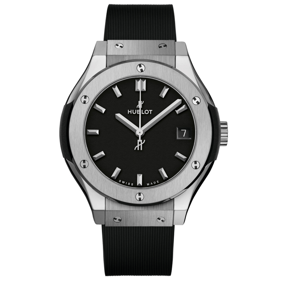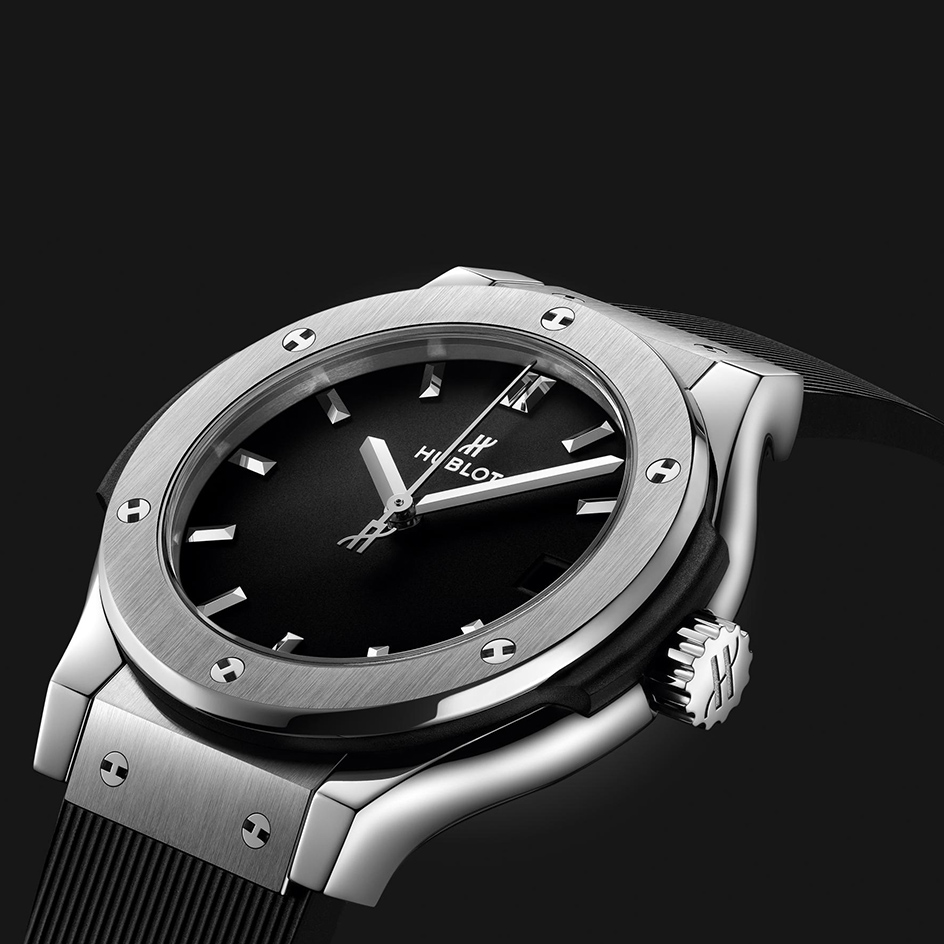 Titanium is extensively used by Hublot, specifically for its lightness. It displays the best relationship between resistance and weight of any material, which makes it an extremely popular material especially within aeronautics. It also stands out with its resistance to corrosion and its inertia in contact with the skin. Hublot only uses high quality, grade 5 titanium, the strongest there is. Once polished, this material retains a slightly bluish metallic sheen.
