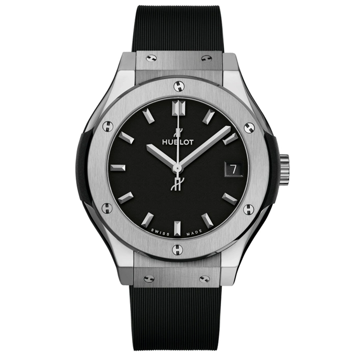 The Hublot Classic Fusion Titanium 581.NX.1171.RX has a quartz movement, Black dial color, Rubber strap and Titanium case material.