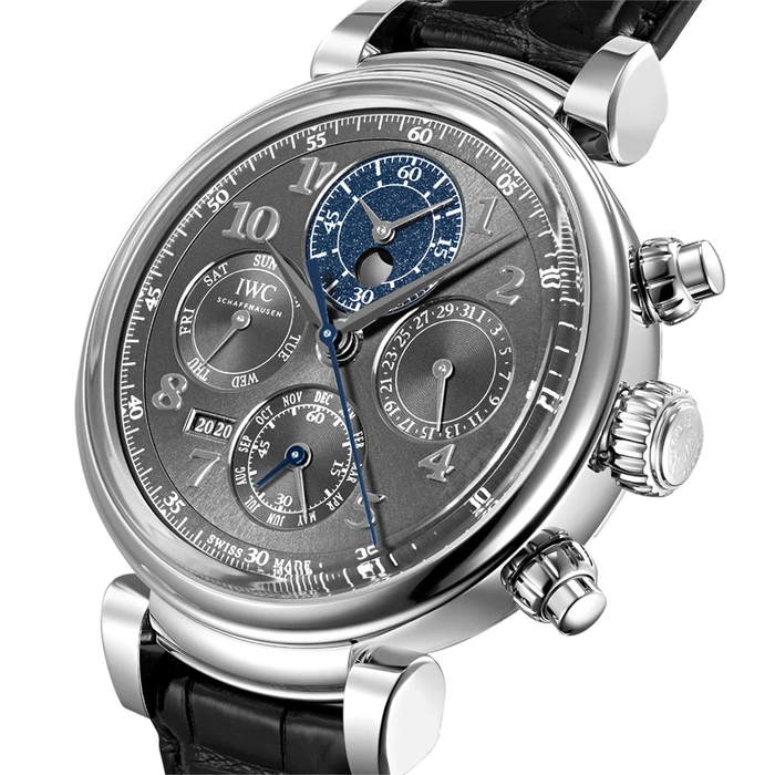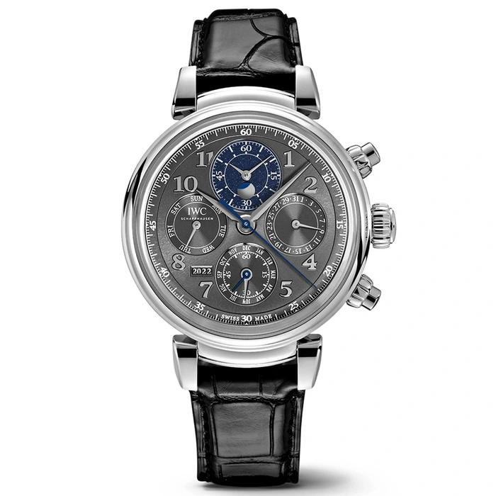 The IWC Schaffhausen Da Vinci Perpetual Calendar Chronograph IW392103 has an Automatic movement, 3 Bar (30 meters) water resistance, Slate-coloured dial, Stainless Steel case and Leather strap with 68 Hours of power reserve.