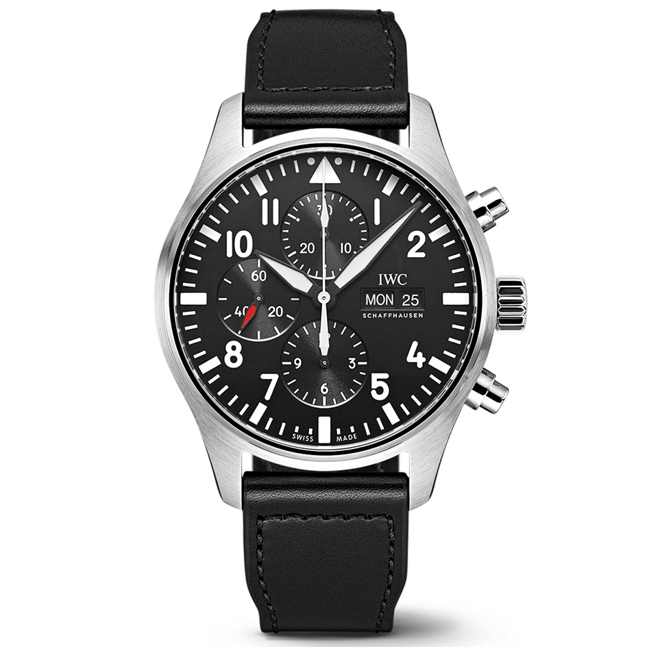 IWC Pilot's Watch Chronograph IW377709 has an Automatic movement, 43 mm case size, 6 Bar (60 meters) water resistance, Black dial, Stainless Steel case and Leather strap with 44 Hours of power reserve.