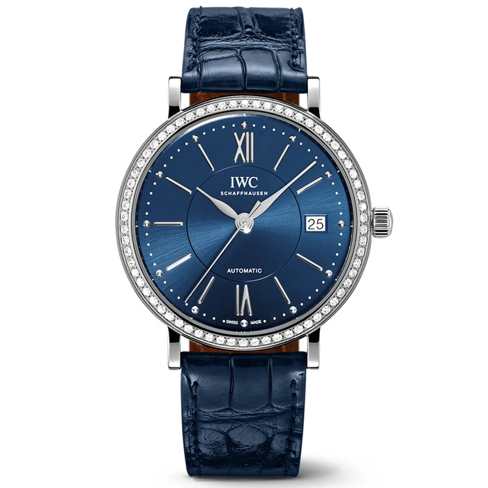 The IWC Schaffhausen Portofino Automatic 37 IW458111 has an Automatic movement, 3 Bar (30 meters) water resistance, Blue dial, Stainless Steel with Diamonds case and Leather strap with 42 Hours of power reserve.