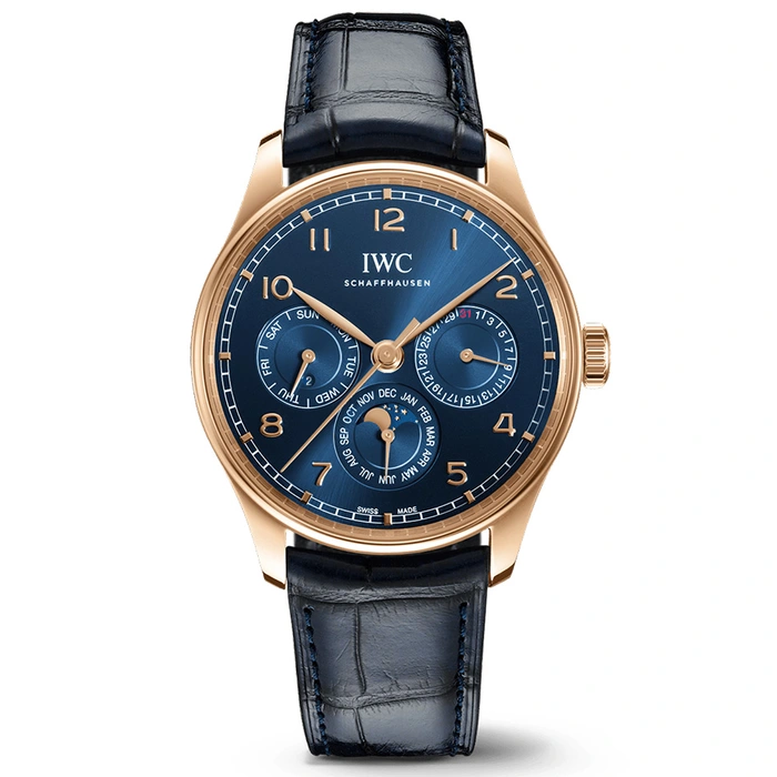 IWC's perpetual calendar, developed by Kurt Klaus in the 1980s, automatically recognizes the different lengths of the months and the leap years and can easily be adjusted via a single crown. Now, for the first time, the complication is integrated into a movement from the 82000-calibre family. The Portugieser Perpetual Calendar 42 displays the date, month and weekday on three subdials at "3 o'clock", "6 o'clock" and "9 o'clock". It also features indications for the moon phase and the leap year. With the help of ceramic components, the IWC-manufactured 82650 calibre's Pellaton winding system builds up a power reserve of 60 hours. This special edition with a diameter of 42 millimetres in a nautical design is available exclusively at IWC Boutiques and online at iwc.com. It has an 18-carat 5N gold case, a blue dial, gold-plated hands, and 18-carat gold appliques. The timeless, elegant Portugieser is fitted with a blue leather strap.