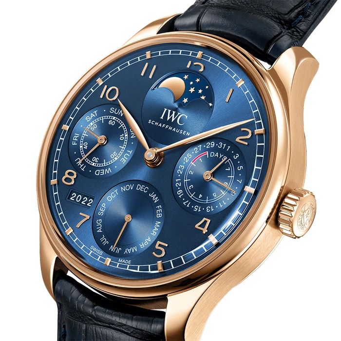 IWC's perpetual calendar, developed by Kurt Klaus in the 1980s, automatically recognizes the different lengths of the months and the leap years. It can be easily adjusted using the crown. The mechanical program will not require any manual correction until 2100. The Portugieser Perpetual Calendar displays the calendar information on four sub-dials. In addition to the displays for the date, the weekday, the month and the moon phase, it features a four-digit year indication and a power reserve display. This special edition is characterized by a maritime design and is available exclusively at IWC boutiques and online at iwc.com. It features an 18-carat Armor Gold® case, a blue dial, gold-plated hands and 18-carat gold appliques. The IWC-manufactured 52610 calibre's Pellaton winding system is fitted with ceramic components and builds up a power reserve of 7 days in two barrels. The decorated movement and the rotor in 18-carat gold are visible through the sapphire glass case back.