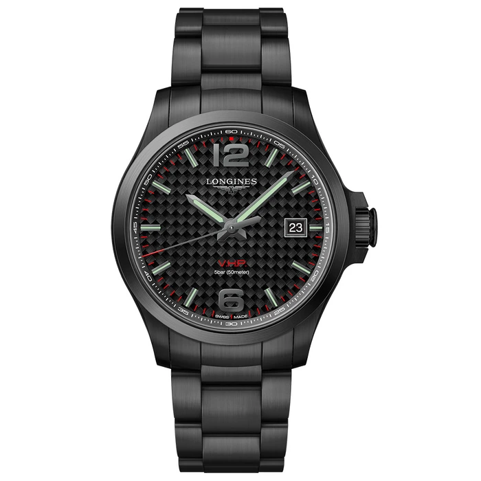 The Longines Conquest V.H.P. L3.726.2.66.6 has a quartz movement, 5 Bar (50 meters) of water resistance, Black dial color, Stainless Steel and Black PVD case and bracelet.