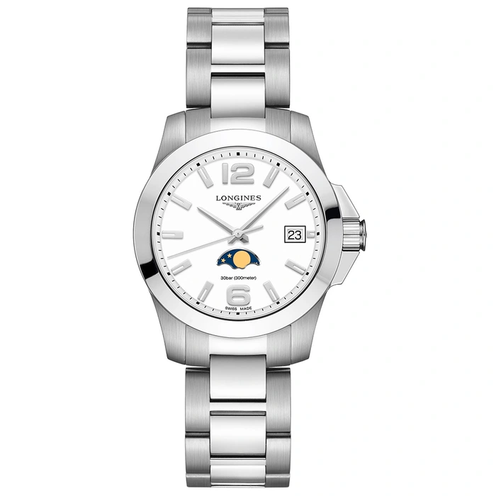 The Longines Conquest L3.381.4.16.6 has a Quartz movement, 30 Bar (300 meters) water resistance, White dial, Stainless Steel case and bracelet.