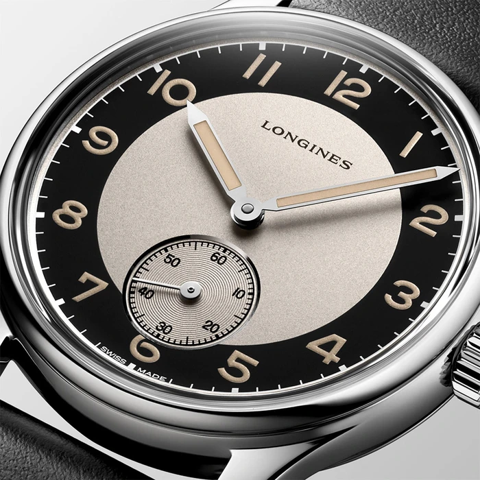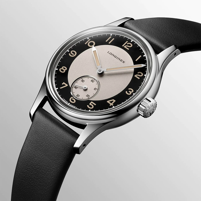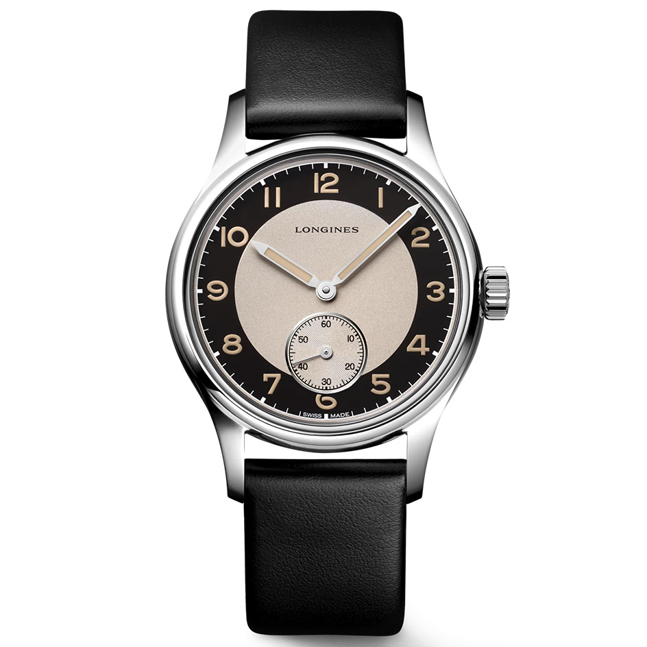 Longines Heritage Classic - Tuxedo L2.330.4.93.0 has an Automatic movement with 72 Hours of power reserve, Black dial color, Stainless Steel case material and Leather strap.