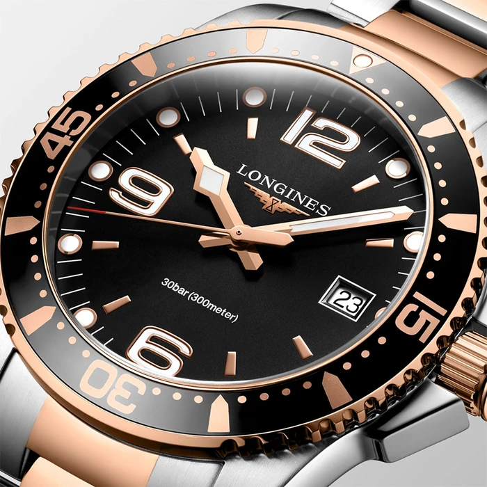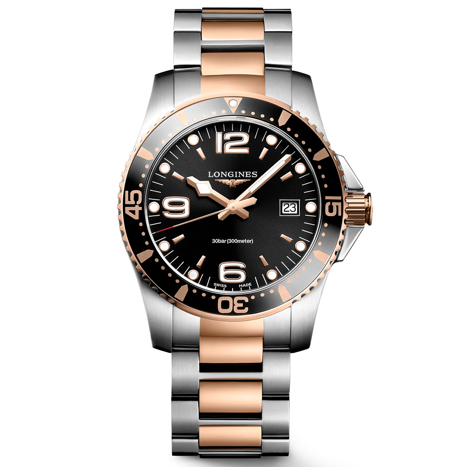 The Longines HydroConquest L3.740.3.58.7 has a quartz movement, Black dial color and Stainless Steel with Pink Gold Plated case material & bracelet.