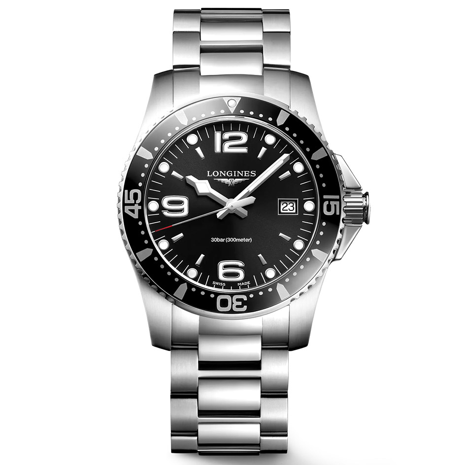 The Longines HydroConquest L3.740.4.56.6 has a quartz movement and a date window at 3 o'clock position, 30 Bar (300 meters) of water resistance, Black dial color and Stainless Steel case material & bracelet.