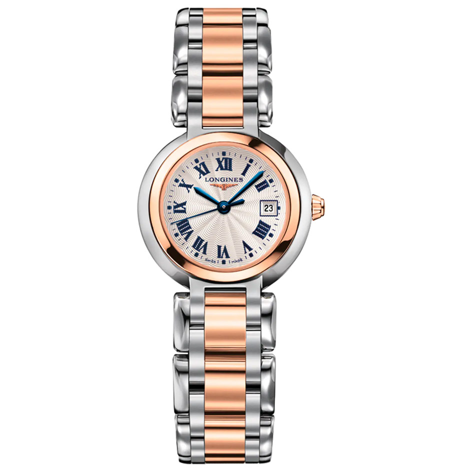 The Longines Primaluna L8.110.5.78.6 has a quartz movement and a date window at 3 o'clock position.