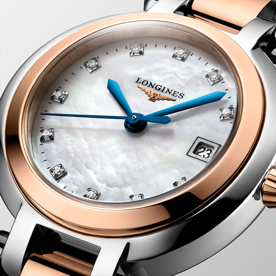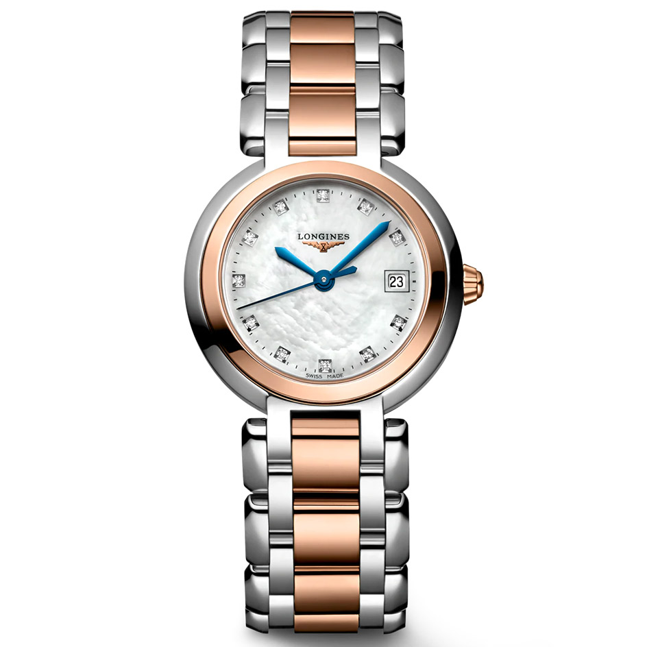 The Longines Primaluna L8.110.5.87.6 has a quartz movement and a date window at 3 o'clock position.