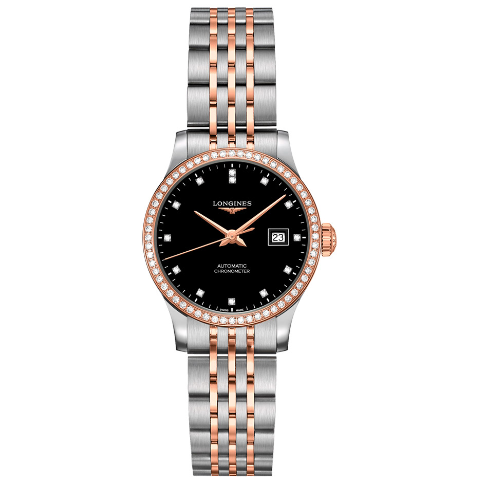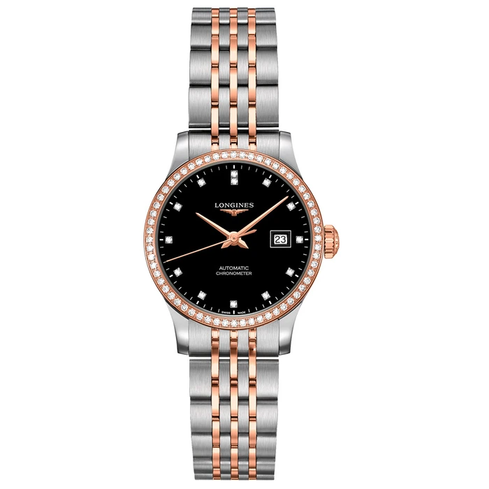 Record Collection L2.321.5.59.7 has an Automatic movement with 40 Hours of power reserve, Black dial color, Stainless Steel & Pink Gold with Diamonds case material and Stainless Steel & Pink Gold bracelet.