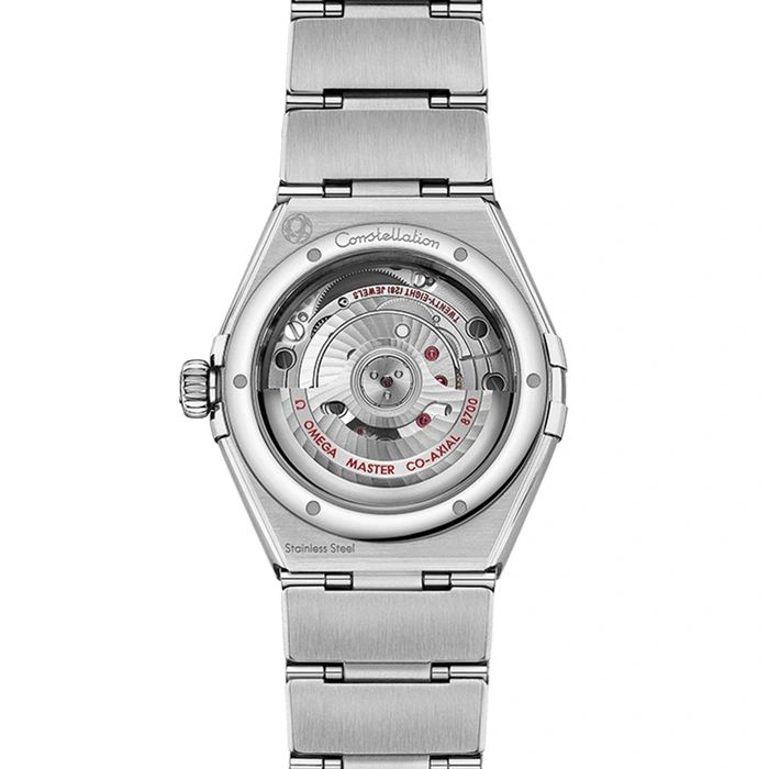 At the heart of this timepiece is the OMEGA Co-Axial Master Chronometer Calibre 8700, visible through the domed scratch-resistant sapphire crystal.