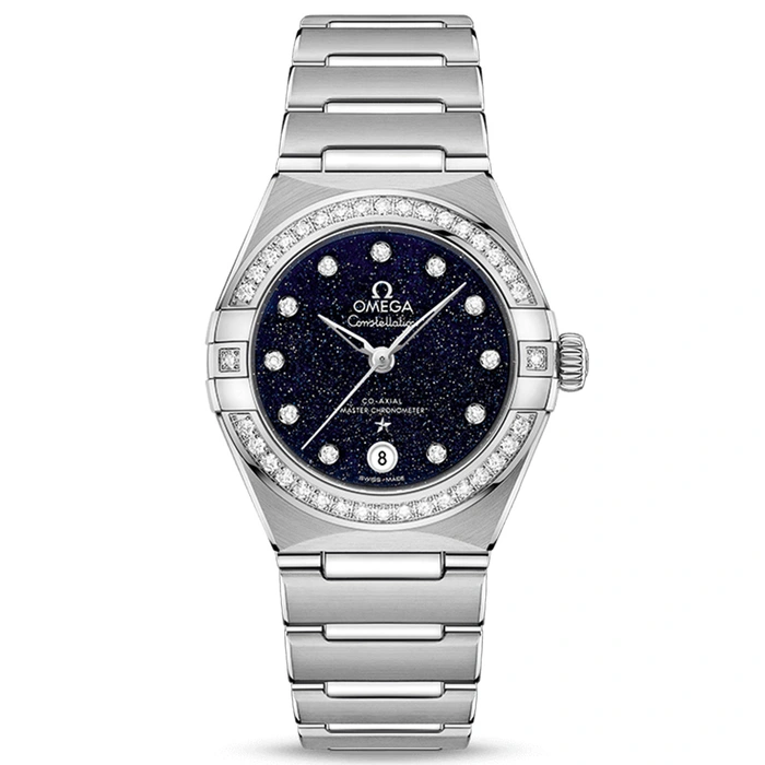 This 29 mm stainless steel model features a diamond-paved bezel, blue aventurine glass dial with diamond hour markers and a date window at the 6 o'clock position. The hands, OMEGA logo, Constellation star and diamond holders are in 18K white gold.