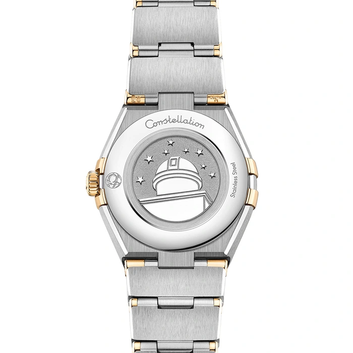 The Omega Constellation 131.20.25.60.53.001 women watch has a quartz movement, 3 Bar (30 meters) of water resistance, Silver dial color, Stainless Steel and Yellow Gold case material with Steel and Gold bracelet.