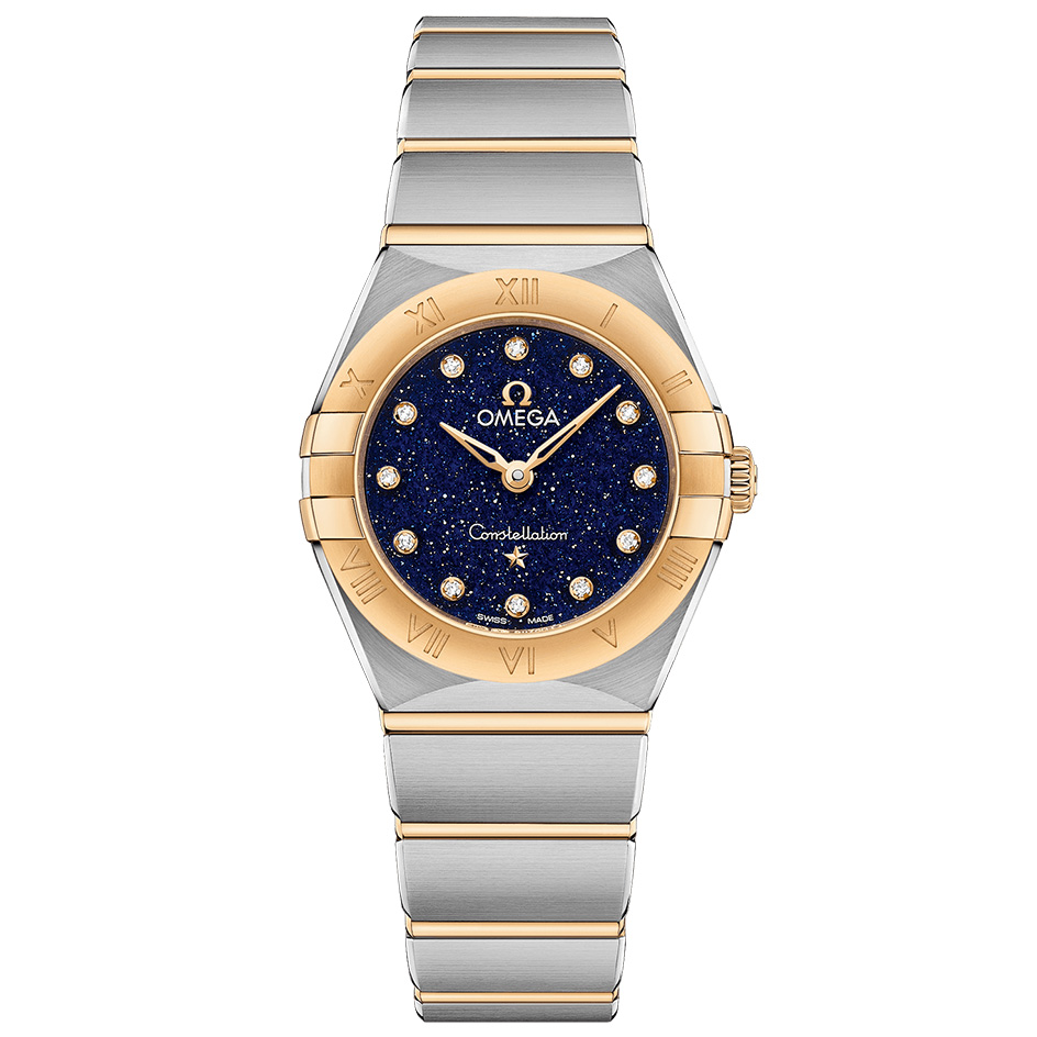 This 25 mm 18K yellow gold and stainless steel model features a bezel with engraved Roman numerals and a blue aventurine glass dial with diamond hour markers. The hands, OMEGA logo, Constellation star and diamond holders are also in 18K yellow gold.