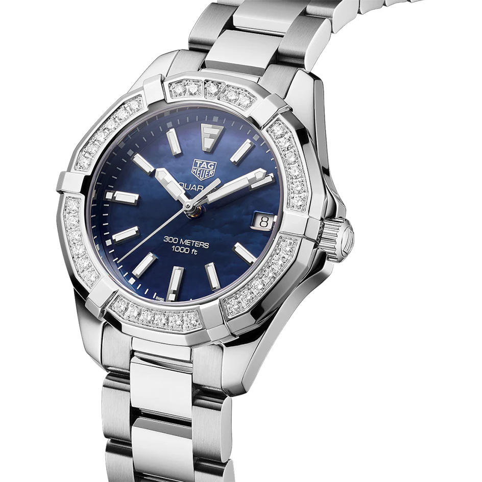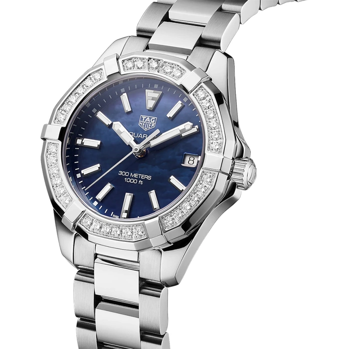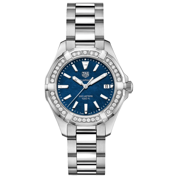 The Tag Heuer Aquaracer WAY131N.BA0748 comes with a Quartz movement with 30 Bar (300 meters) of water resistance, Stainless Steel case material, Steel bracelet and Mother of Pearl Blue dial color.