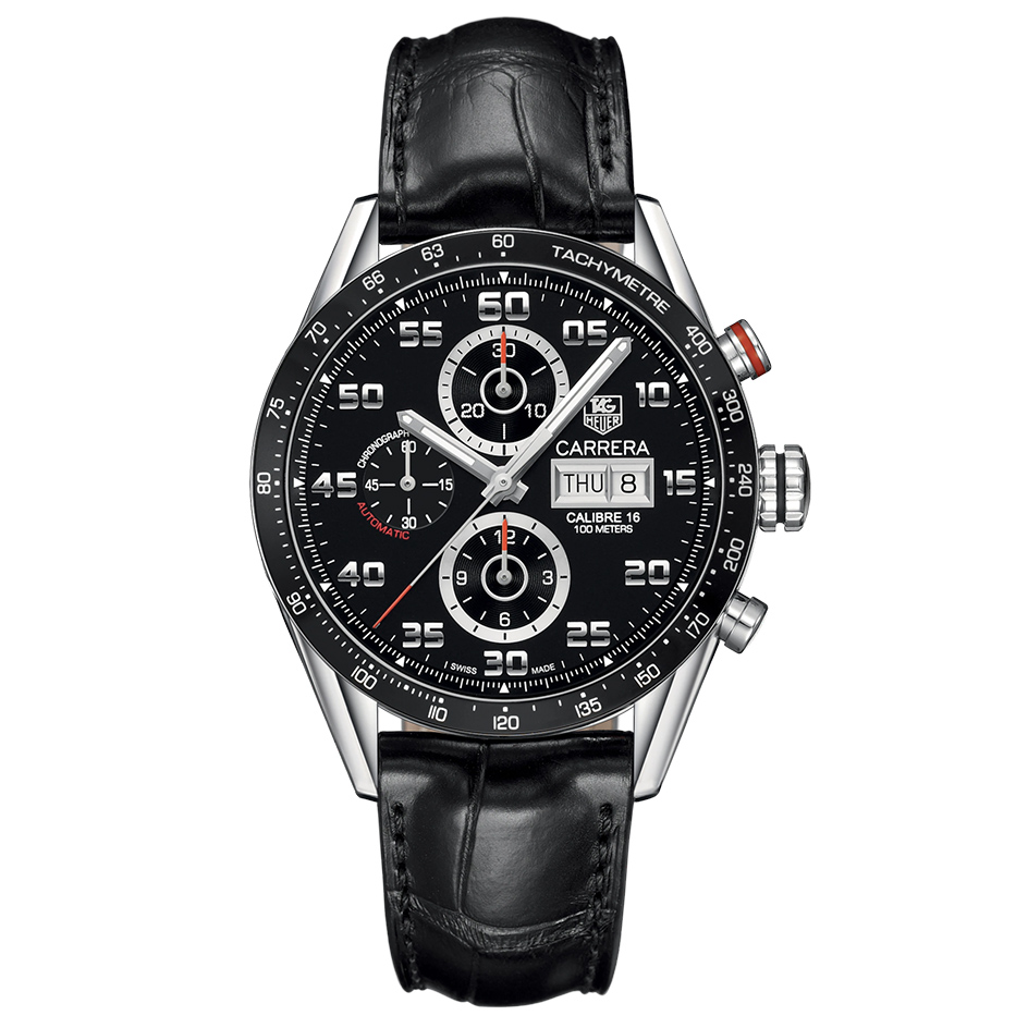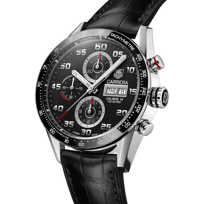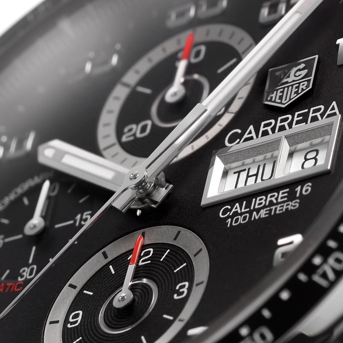 The Tag Heuer Carrera Calibre 16 CV2A1R.FC6235 has an automatic movement with 42 hours of Power Reserve, 10 Bar (100 meters) of water resistance, Stainless Steel case material, Leather strap and Black dial color, a day-date window at 3 o'clock position and a chronograph feature.