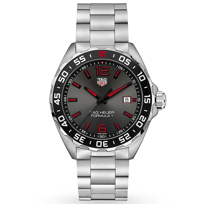 The Tag Heuer Formula 1 WAZ1018.BA0842 comes with a Quartz movement with 20 Bar (200 meters) of water resistance, Stainless Steel case material, Steel bracelet and Grey dial color.